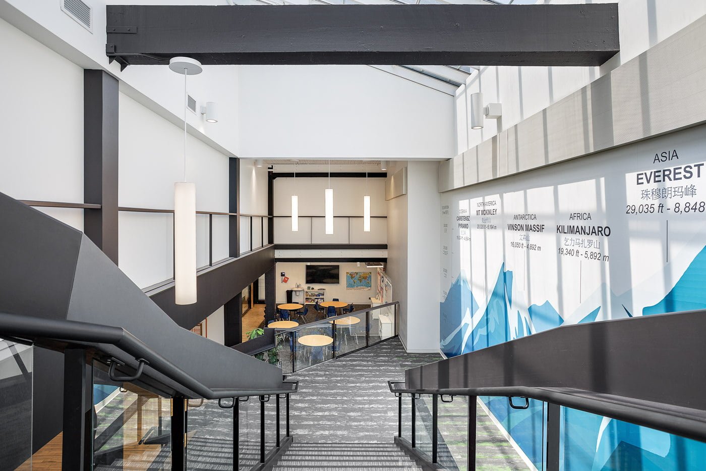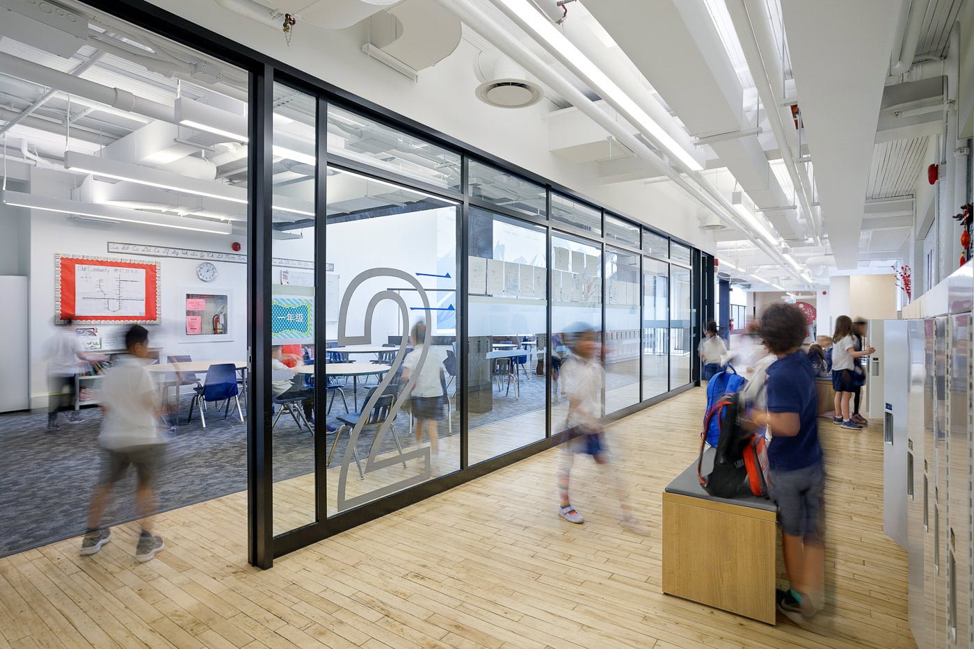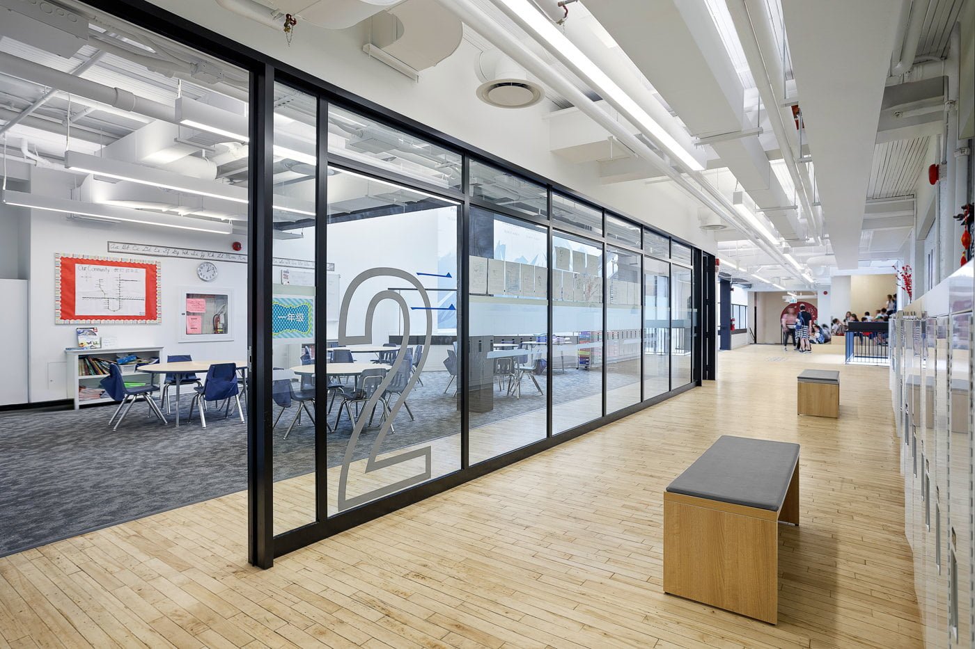 Classrooms were designed with glass and PC 350 frames to maximize natural light. Mandarin symbols alongside English translations label classrooms. An awe-inspiring mural of the world's tallest peaks in the atrium helps students learn about mountains and elevations in both languages.