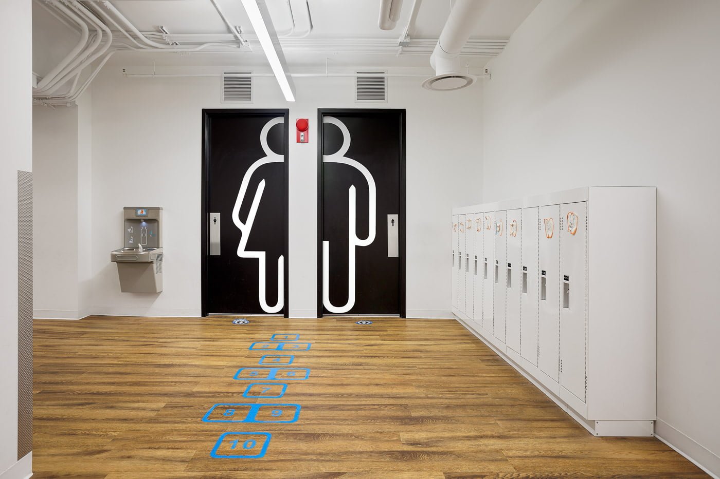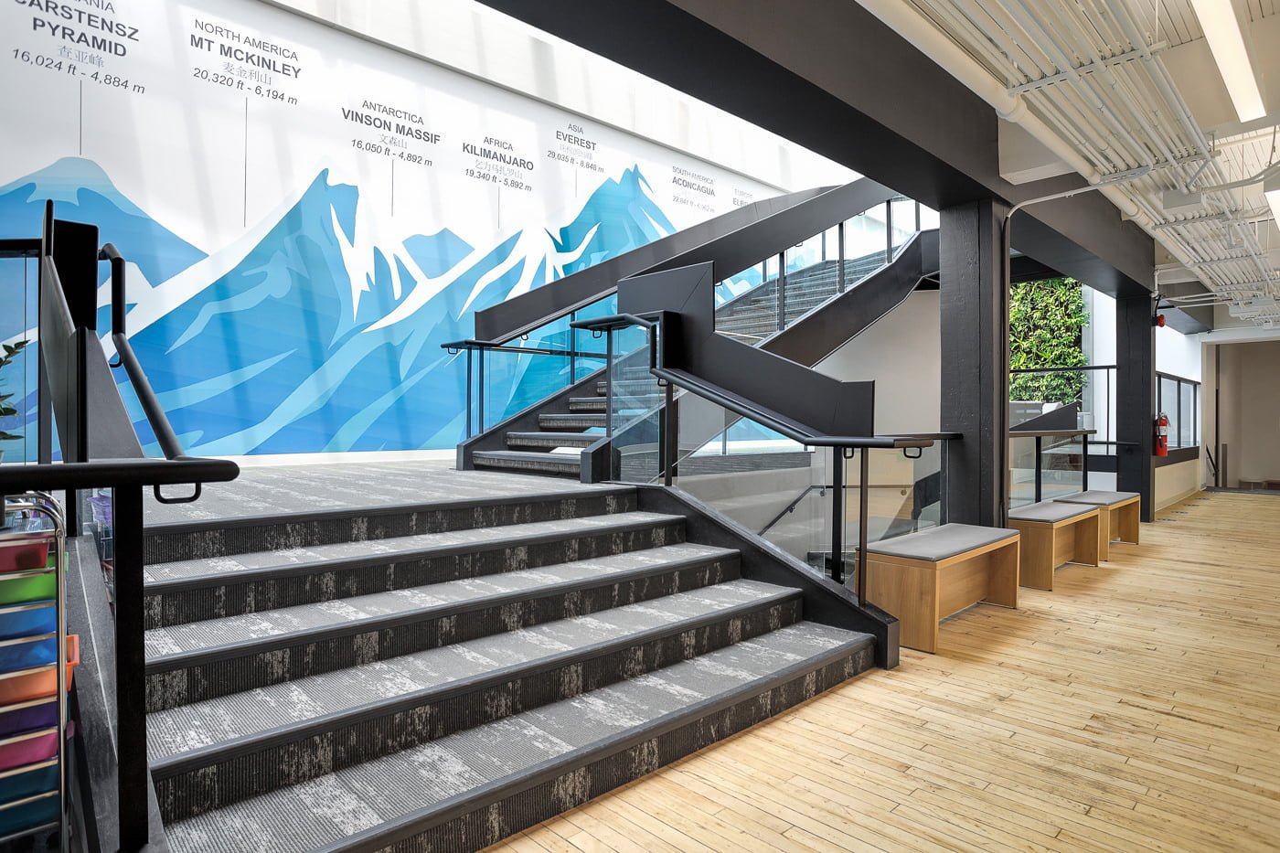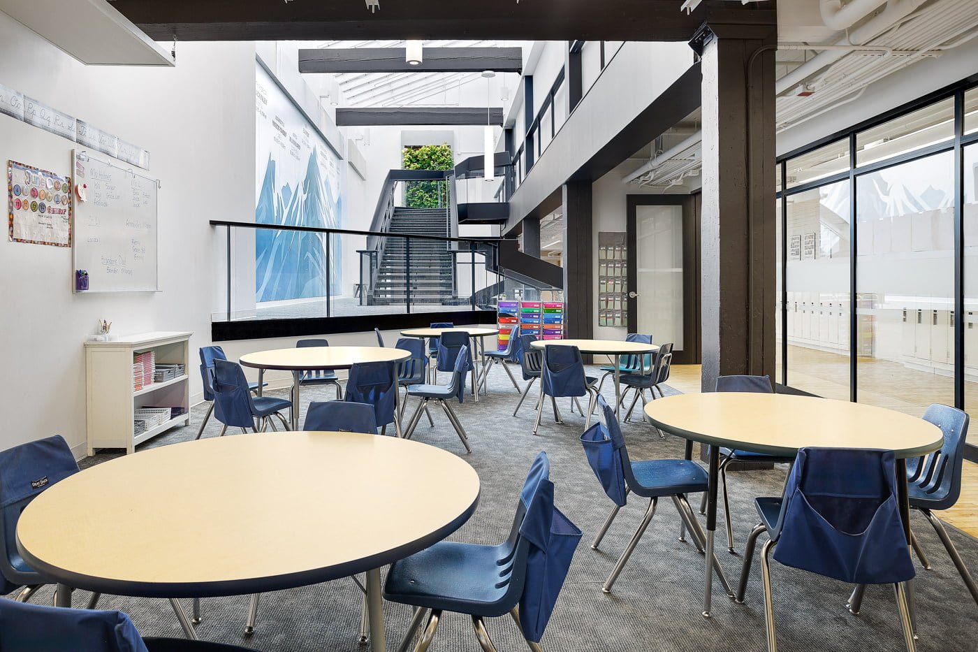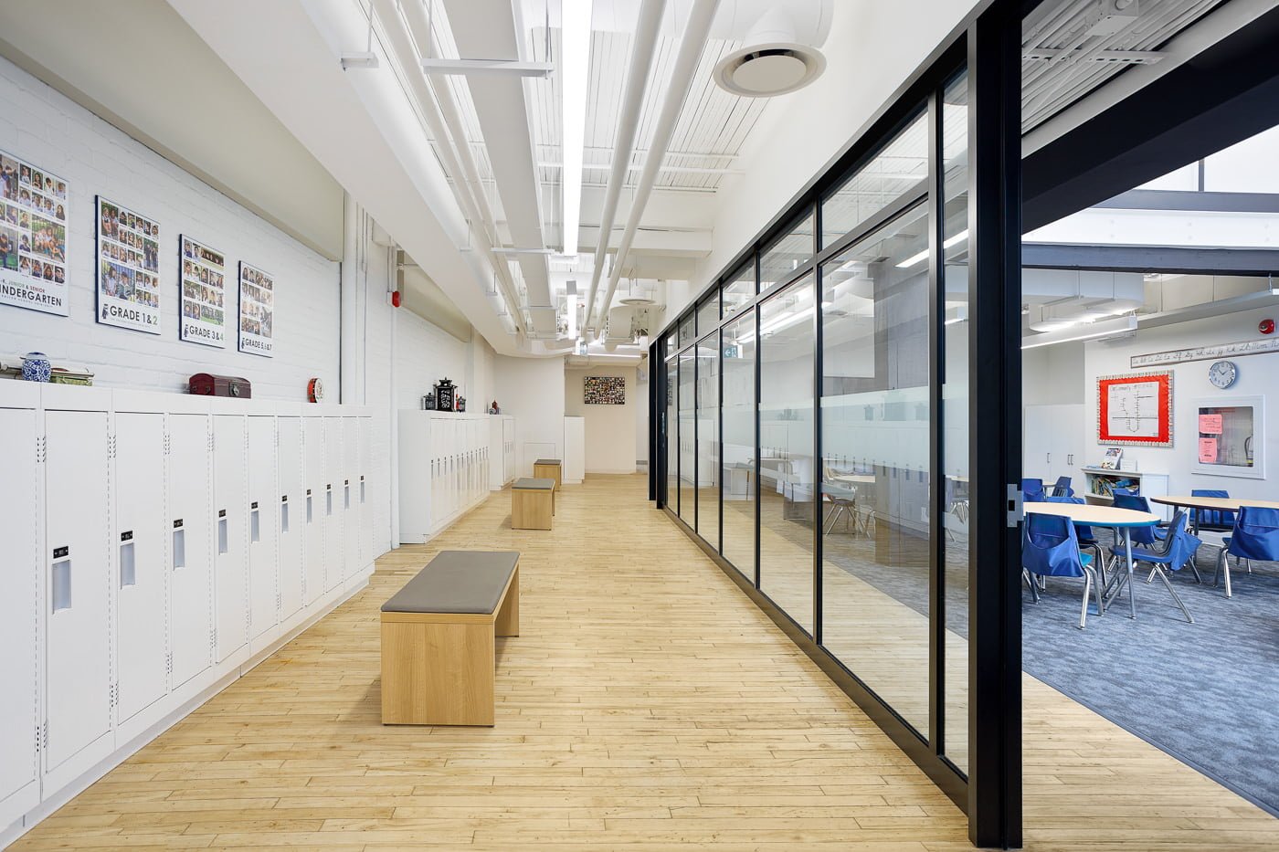 Classrooms were designed with glass and PC 350 frames to maximize natural light. Mandarin symbols alongside English translations label classrooms. An awe-inspiring mural of the world's tallest peaks in the atrium helps students learn about mountains and elevations in both languages.