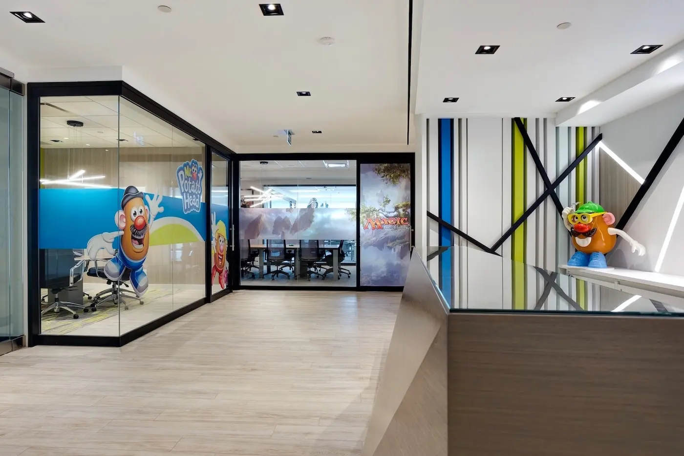 In the new 15,000 sq.ft. Canadian office, natural wood-materials, textures and patterns of a folded edge are seen throughout the walls, millwork, flooring and lighting, which provide an exciting yet professional energy that welcomes employees, buyers and guests alike. The team at Hasbro Canada have found a new and creative energy in this innovative office.