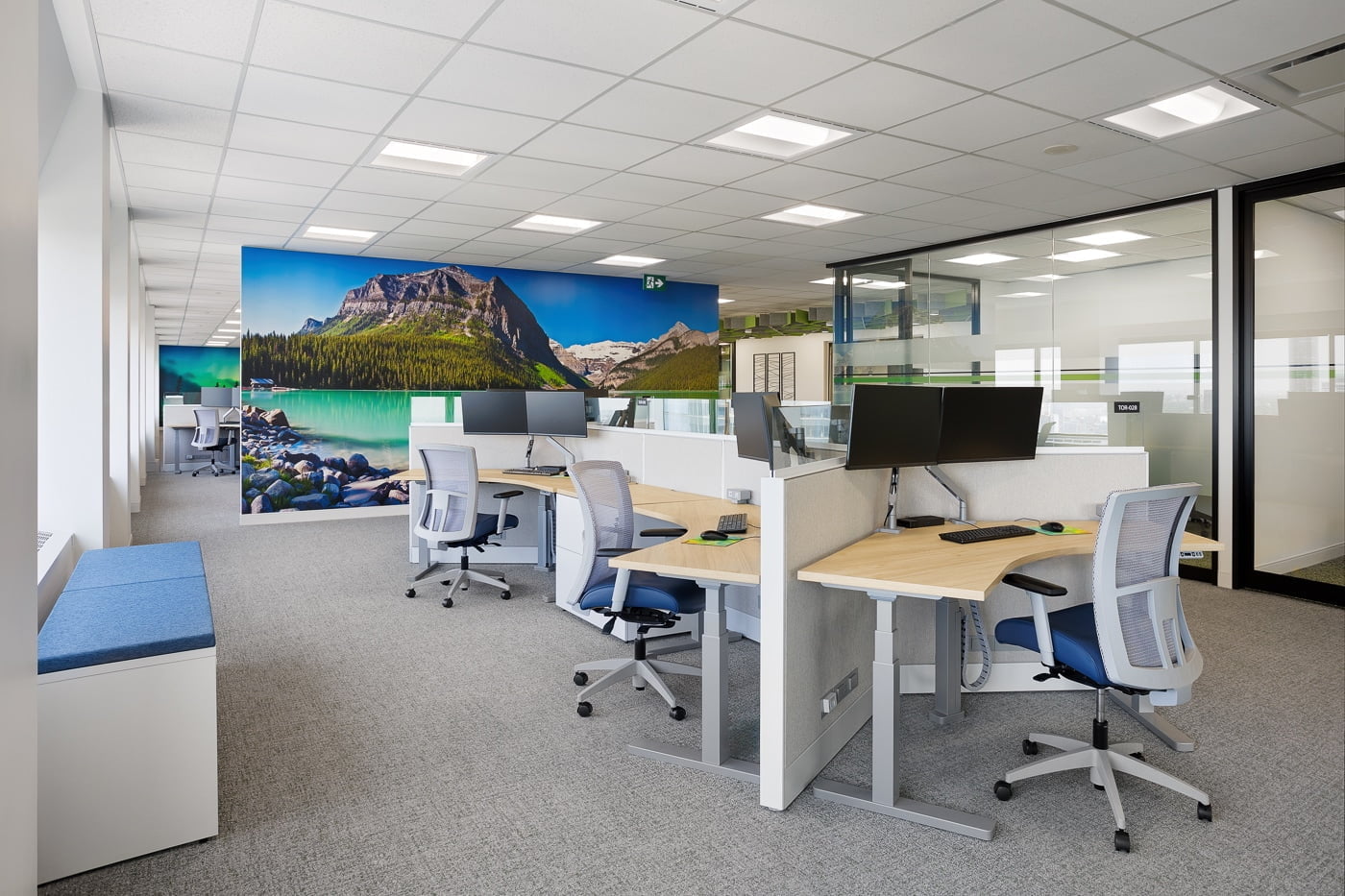 This modern workspace offers employees flexibility in choosing how and where they work. It includes Hybrid Rooms integrated with Microsoft Teams, an adaptable Conference Room, and private spaces like Pods, Casual Rooms, and a Wellness Room, all named after National Parks and easily bookable through calendar software. The Staff Lounge encourages human connection with banquette seating and a biophilic design, maintaining the corporate identity.