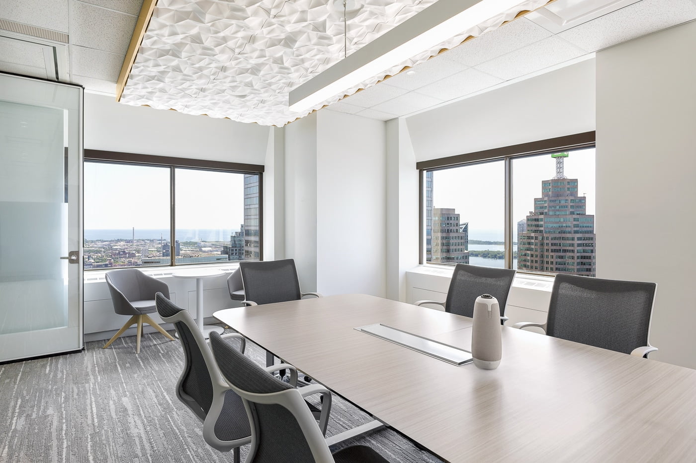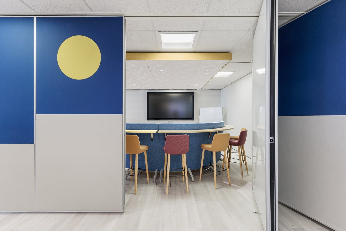Bullock+Wood Design incorporated vibrant colors, contemporary furnishings, modern tech, and a graphic wall inspired by Toronto landmarks.